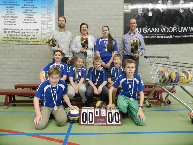 Dankzij twee maal 2-1 winst op resp, Tweevv en Gemini veroverden de N6 spelers van vv Lienden 13 dec. het kampioenschap in de Nevobo A poule. Na terugkeer uit Renkum werden de nieuwe kampioenen in het thuishonk in het bijzijn van familie, vrienden, vriendinnetjes en teamsponsor Edwin van Dijk van hoveniersbedrijf Van Dijk in het zonnetje gezet. Alle spelers kregen als beloning voor hun formidabele prestatie een dikverdiende “gouden"medaille. Bloemen waren er voor Ronald en Corina, de beide coaches die aan het succes hebben bijgedragen en voor shirtsponsor Van Dijk. Anna, Levske, Susan, Geertjan, Jelle, Thom en Rutger zijn de spelers van het mixedteam dat deze mooie prestatie heeft neergezet. Top!