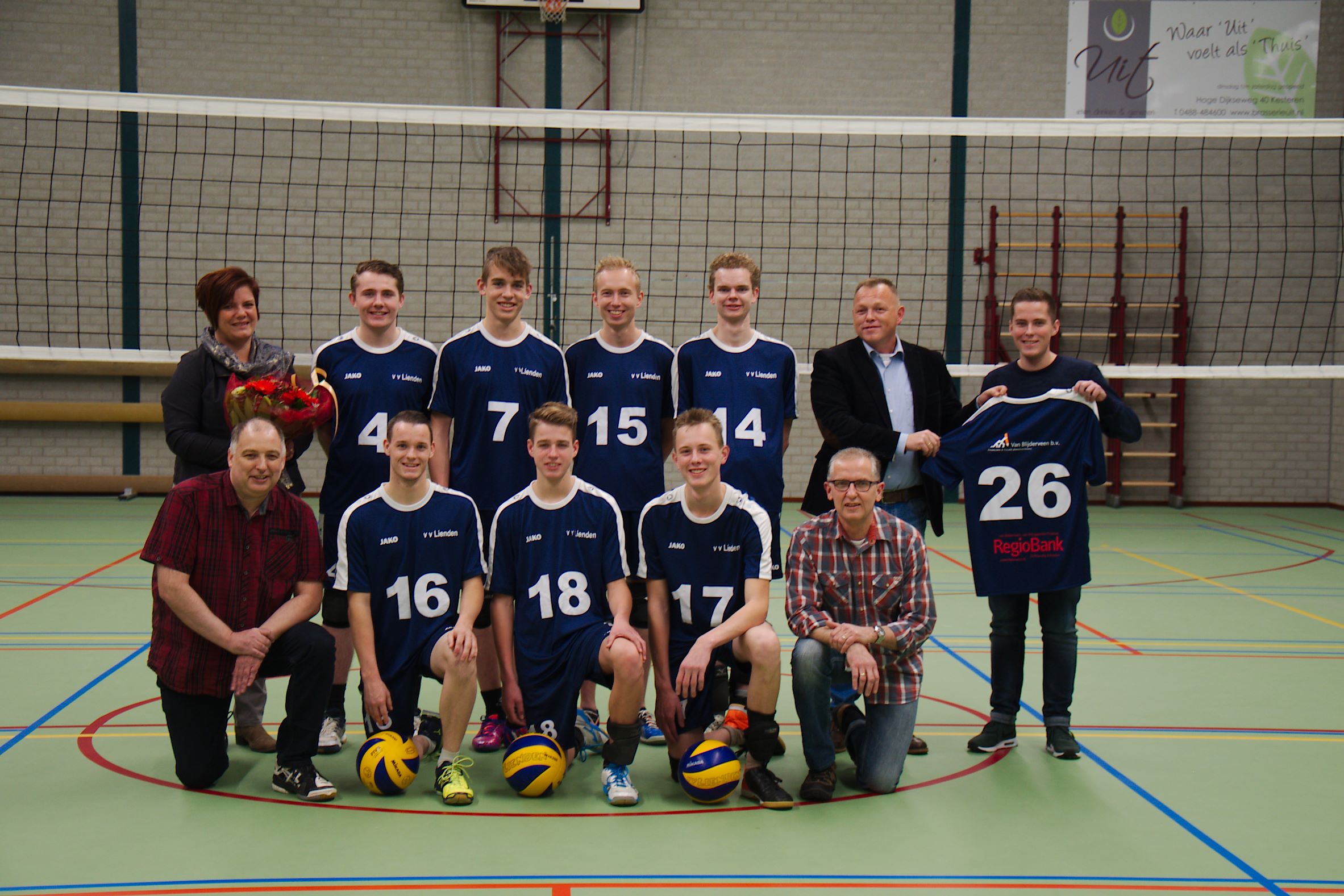 LIENDEN - Sinds een paar maanden speelt een nieuw team van volleybalclub vv Lienden in de Nevobo competitie. Bij een nieuw team hoort ook een nieuwe sponsor en dus werden de spelers van vv Lienden in het nieuw gestoken door RegioBank en Van Blijderveen financiële & fiscale dienstverleners uit Lienden. Aan het begin van hun thuiswedstrijd tegen Invicta overhandigde directeur Van Blijderveen de fraaie outfit aan de Liendense spelers. De volleyballers zijn blij met hun wedstrijdtenue en zien de samenwerking met sponsor RegioBank/Van Blijderveen b.v. helemaal zitten.